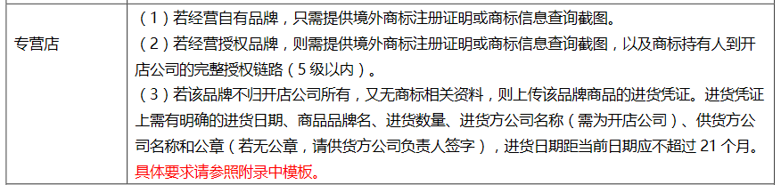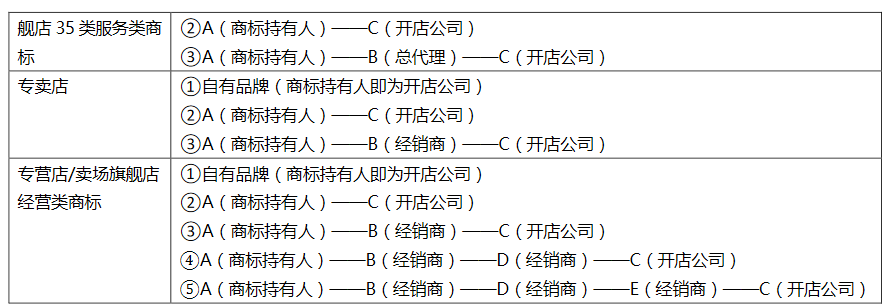 (3)完整授權(quán)鏈路是指,以三級授權(quán)為例,ABC公司中,A為商標持有人(一級),B為經(jīng)銷商(二級),C為開店公司(三級)。則A-B-C即為完整授權(quán)鏈路。開店公司C需提供A—B的授權(quán)書和B—C的授權(quán)書才可成功開設(shè)店鋪。