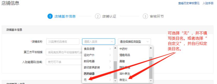 ②旗艦店和專營店類目設(shè)置為選填,當(dāng)選擇“無”時,店名中可不加入類目詞。且支持商家選擇“自定義”并自主擬定類目名。