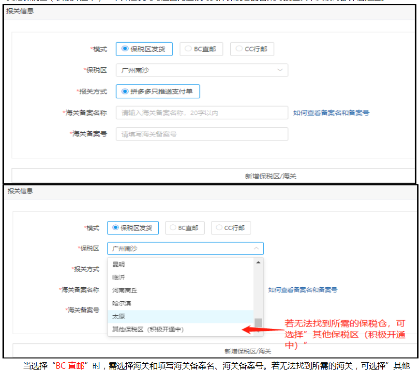 當(dāng)選擇“保稅區(qū)發(fā)貨”時,需選擇保稅區(qū)和填寫海關(guān)備案名、海關(guān)備案號。若無法找到所需的保稅倉,可選擇”其他保稅區(qū)(積極開通中)”,并建議先與運營溝通核對具體保稅倉的備案對接進度,反饋內(nèi)部評估推進。