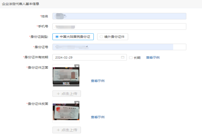 此處需上傳企業(yè)法定代表人的中國大陸居民身份證圖片、填寫企業(yè)法定代表人的手機號,并按照身份證圖片準確填寫姓名、身份證號、身份證件有效期。