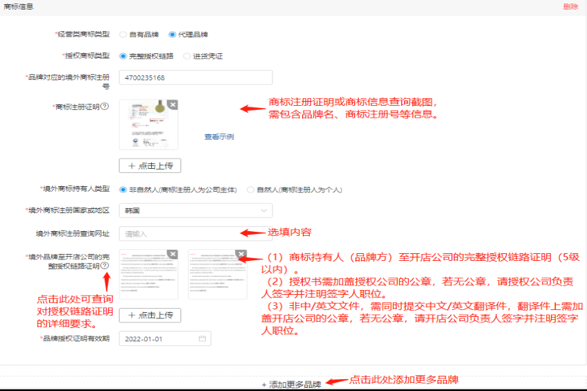 經(jīng)營類商標需至少上傳1個,點擊“添加更多品牌”進行添加。