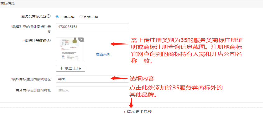 若35類服務(wù)類商標為開店公司自有,服務(wù)類商標類型請選擇自有品牌,并填寫商標注冊號和上傳境外商標注冊證明或商標信息查詢截圖。