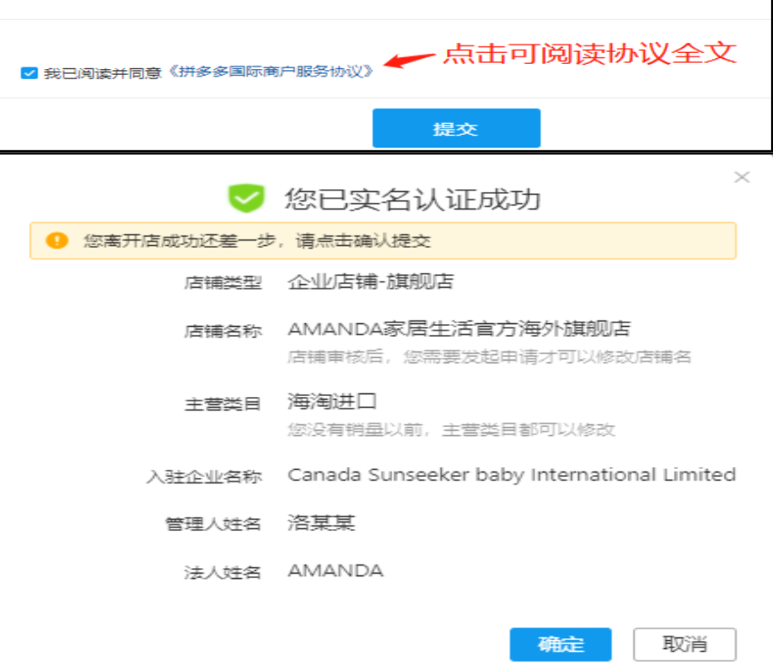 第24頁勾選我已閱讀并同意《拼多多國際商戶服務(wù)協(xié)議》,并點擊“提交”。系統(tǒng)會彈出店鋪信息內(nèi)容,請您認真核對信息,若確認無誤,則點擊“確認”;若需要修改,請點擊“取消”重新進入編輯。