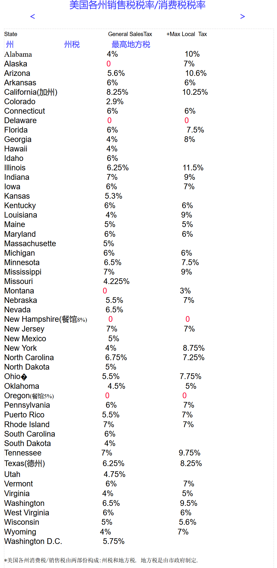 美國各州銷售稅率/消費稅稅率州名稱 州稅最高地方稅: