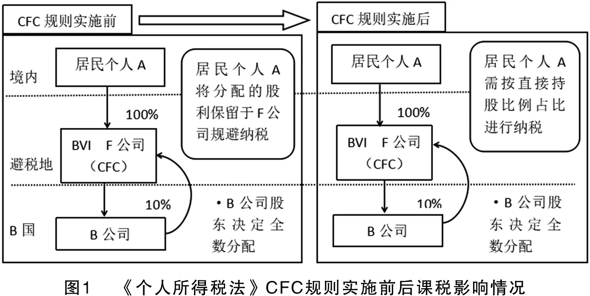 《個人所得稅法》引入CFC規(guī)則后,在CRS涉稅信息交換的大背景下,若CFC向居民個人分配的利潤不合理地偏低時,我國稅務(wù)機關(guān)可依據(jù)CFC設(shè)立地主管稅務(wù)當(dāng)局交換回的信息進行納稅調(diào)整。此外,即使不進行分配,稅務(wù)機關(guān)可將累積于CFC未向居民個人分配的所得,按居民個人直接持股比例視同分配,對居民個人進行征稅(如圖1所示)。