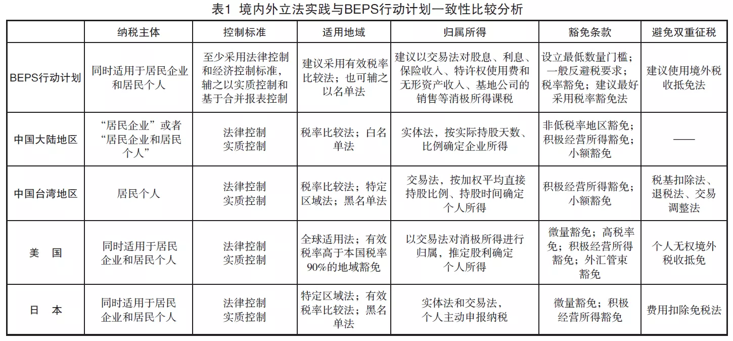 自美國最早立法引入CFC規(guī)則后,德國、新西蘭、日本等國也都先后引入CFC規(guī)則。目前來看,美國和日本的CFC規(guī)則同時適用于居民企業(yè)和居民個人。中國臺灣地區(qū)在最新反避稅浪潮下也于個人所得稅制度中引入了該規(guī)則,且進行細(xì)化規(guī)定。2015年9月,稅基侵蝕和利潤轉(zhuǎn)移(BEPS)第3項行動計劃《制定有效的受控外國公司規(guī)則》最終報告發(fā)布,對CFC規(guī)則進行了詳盡的闡述,主要從CFC的定義、豁免條款、防止或消除雙重征稅,以及收入的定義、計算、歸屬六個方面進行政策考量,并為各個國家建立和規(guī)范CFC規(guī)則體系提供了最佳建議。此外,我國《個人所得稅法》中首次引入CFC規(guī)則,是在我國《企業(yè)所得稅法》實施CFC規(guī)則十余年之后,因此《個人所得稅法》中該規(guī)則的完善,要充分考慮與企業(yè)所得稅相關(guān)規(guī)定的銜接,并借鑒企業(yè)所得稅反避稅經(jīng)驗,以便我國在未來建立起統(tǒng)一完善的CFC反避稅規(guī)則體系。因此,本文對我國大陸地區(qū)《企業(yè)所得稅法》、我國臺灣地區(qū)“所得基本稅額條例”、美國《國內(nèi)收入法典》、日本《租稅特別措施法》和BEPS行動計劃中CFC規(guī)則的立法實踐經(jīng)驗進行了總結(jié)(見表1)。
