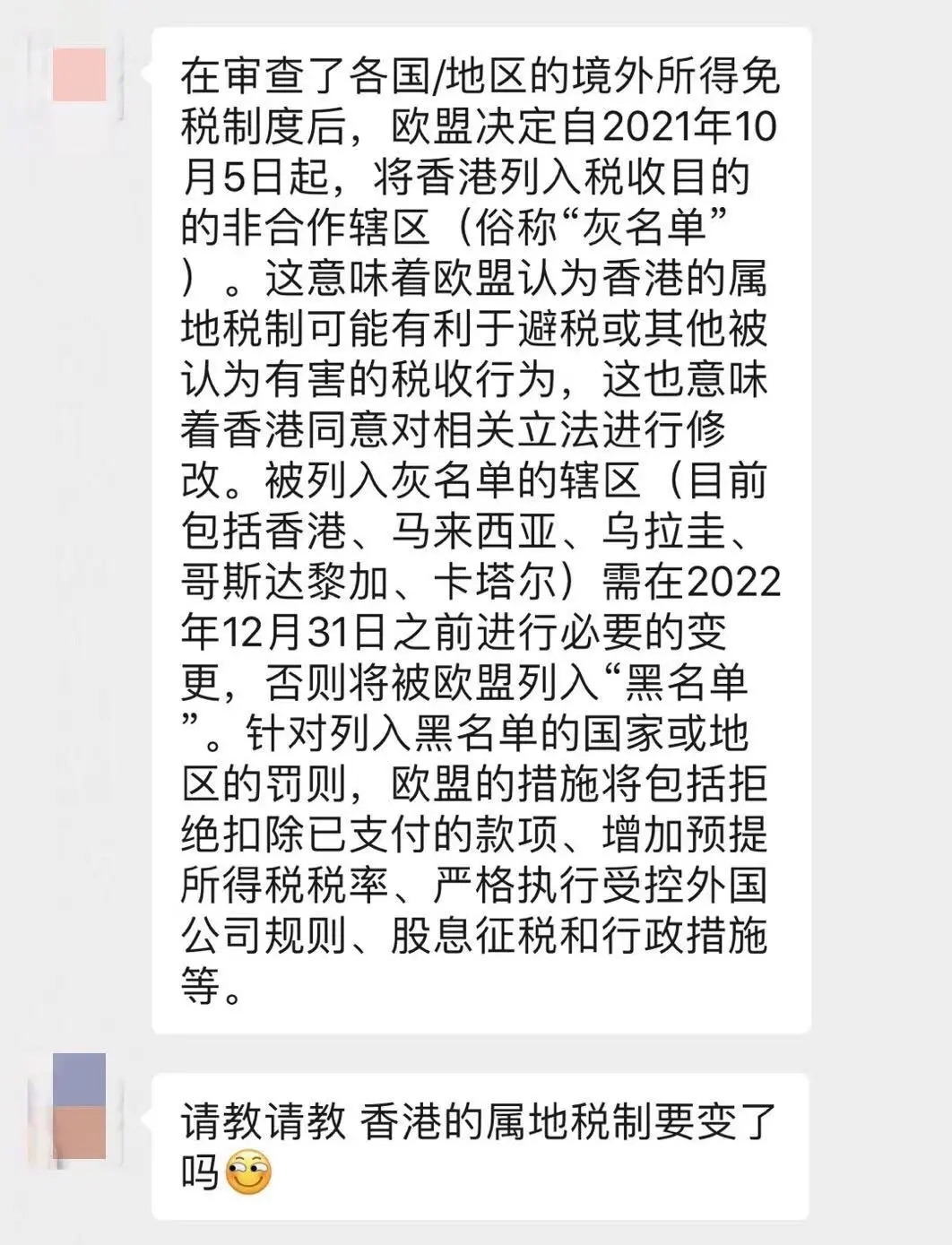 更為重要的是,發(fā)言人還表示,香港特區(qū)政府在支持打擊跨境避稅的大原則下,愿意做出配合,并已向歐盟承諾將于2022年底前修訂香港《稅務(wù)條例》及于2023年落實相關(guān)措施。