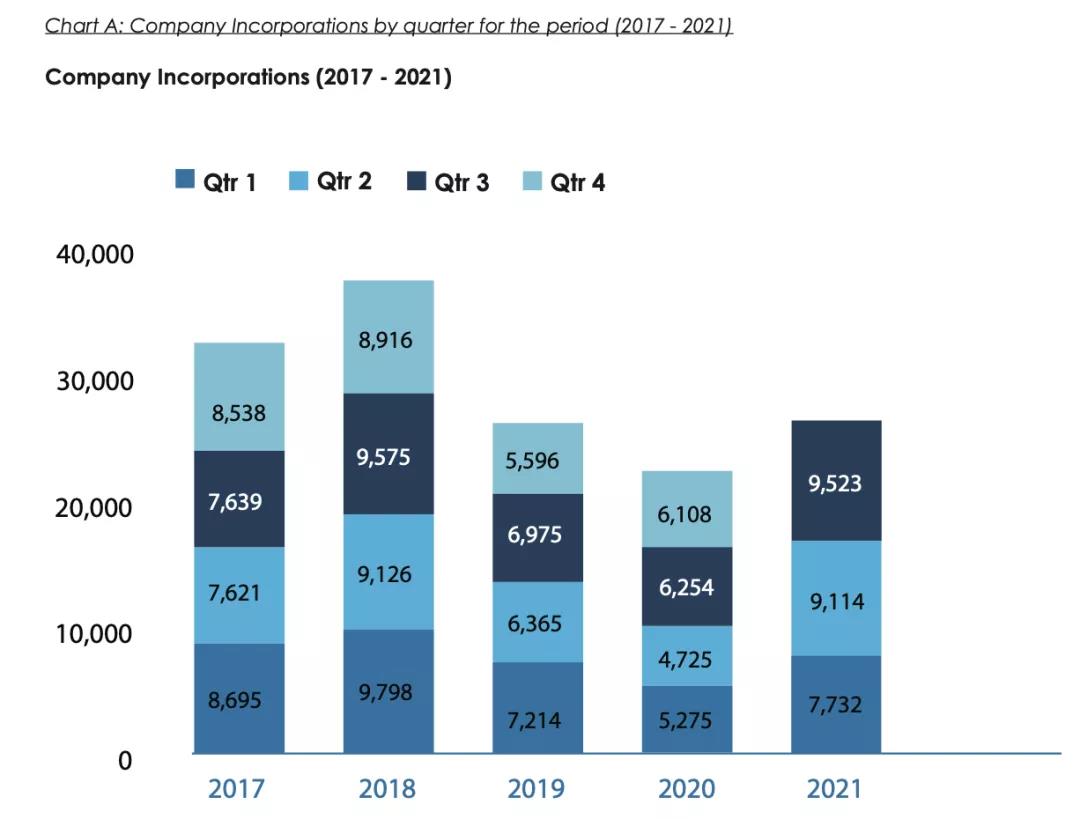 在看具體數(shù)據(jù)前,需要明確的一點(diǎn)是,在BVI公司注冊(cè)包括:新的商業(yè)公司(BCs)、私人信托公司、外國(guó)公司和續(xù)體(continuation)。