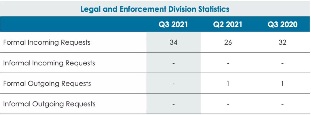 在2021年第三季度,BVI總計(jì)實(shí)施了34起的信息交換申請(qǐng),無(wú)論是與2020年第三季度(32起)同比,還是與2021年第二季度(26起)環(huán)比,都略有增加。