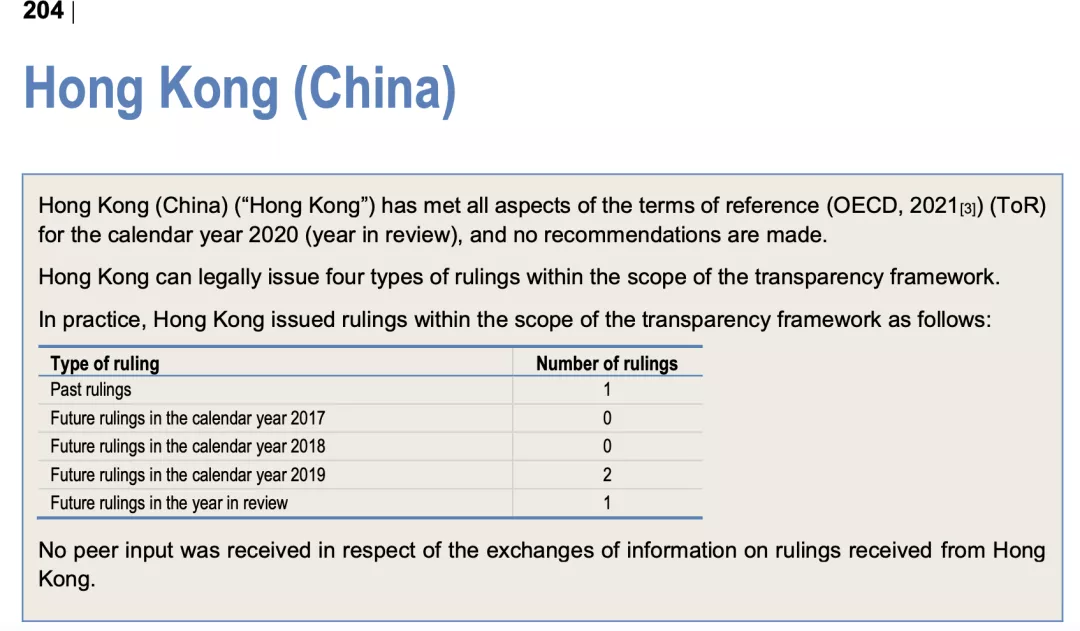 出人意料的是,中國(guó)澳門雖然在法律上符合了OECD的機(jī)制要求,但在2020年一年未發(fā)布任何與稅收信息交換相關(guān)的新規(guī)則,因此并未出現(xiàn)在2020年的同儕審查名單上。