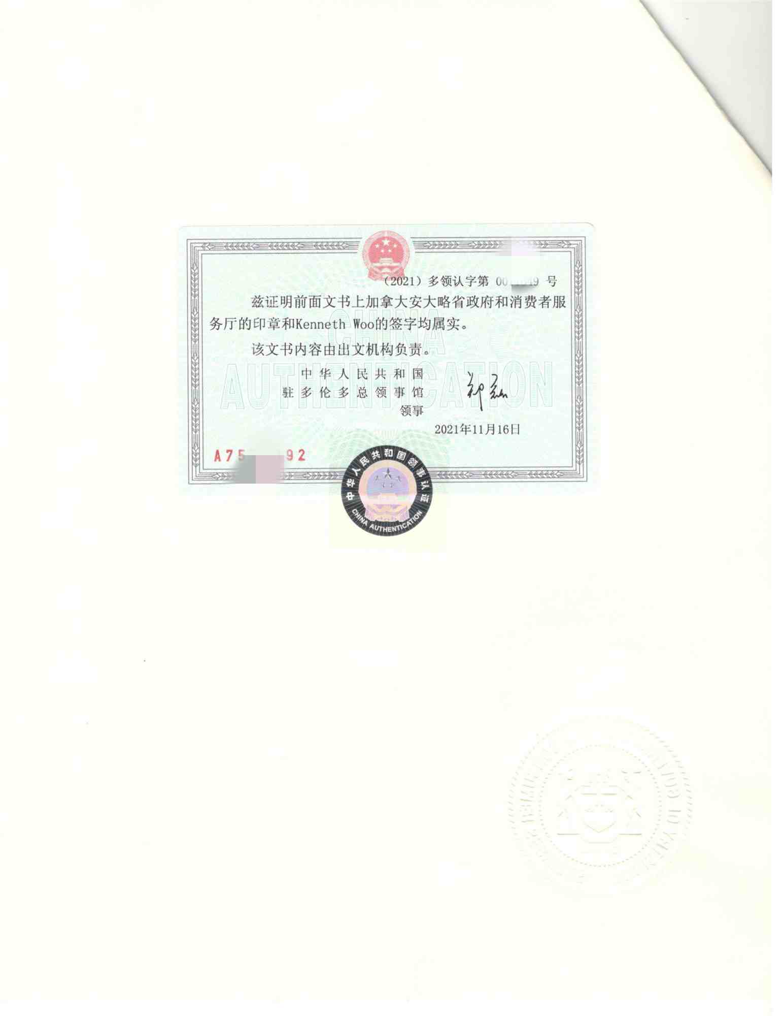 送由中國(guó)駐加拿大多倫多使領(lǐng)館進(jìn)行認(rèn)證。