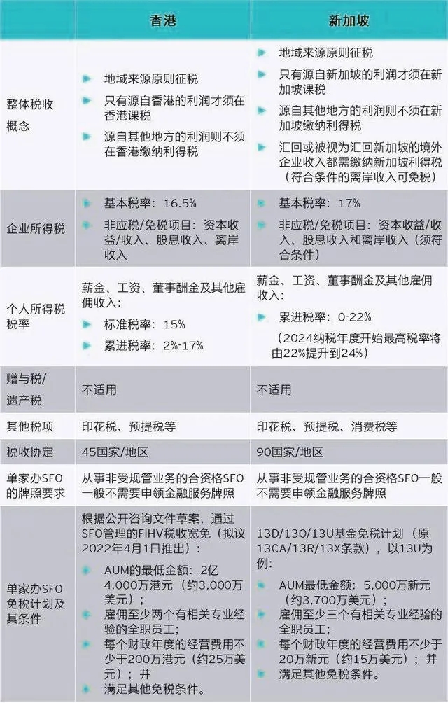 但是,如果您仔細對比,還是能夠感受到香港在境外利潤征稅、企業(yè)所得稅基本稅率、SFO最低管理資產(Assets under Management, AUM),以及雇傭有經驗全職員工要求等方面的門檻略低于新加坡。