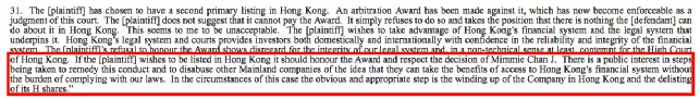 夏利士法官在判決書中說,針對晨鳴紙業(yè)的行為作出懲罰不僅符合公共利益,而且會打消一些內(nèi)地企業(yè)既想通過香港的金融體系獲利,又不愿遵行香港法律的念頭 。