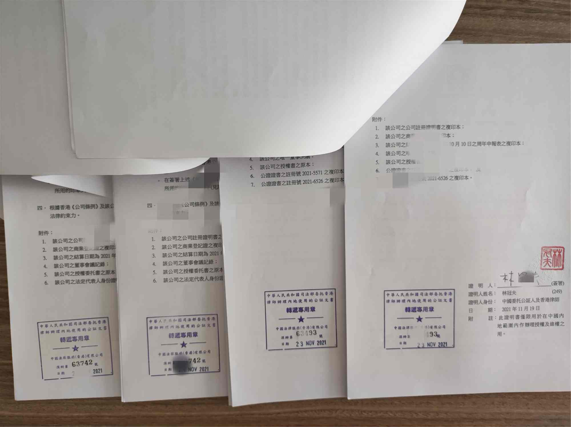 需將前述文件一并送交中國司法部指定的中國委托公證人(相關(guān)的律師名單司法部每年均有公告)進(jìn)行公證再交由中國法律服務(wù)(香港 )有限公司加蓋轉(zhuǎn)遞專用章,前述文件只有在履行了這兩個手續(xù)后方能在中國大陸地區(qū)作為正式的法律文件使用。
